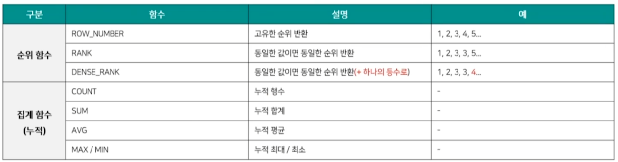 *윈도우함수는 순위함수와 집계함수(누적)으로 나눈다.