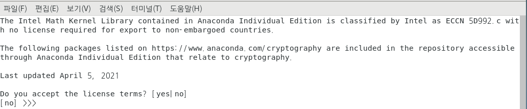 🐍7. 쭉 내리다보면 아래 화면처럼 라이센스 동의 하냐고 물어보면 yes라고 작성해준다.