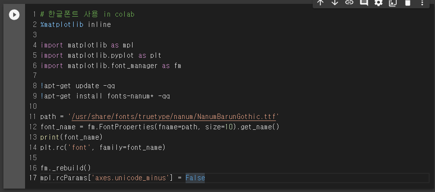 3.설치한 폰트로 설정해준다 : 폰트설정하는 방법은 그냥 아까 코드 셀을 실행하면 되는 거다!