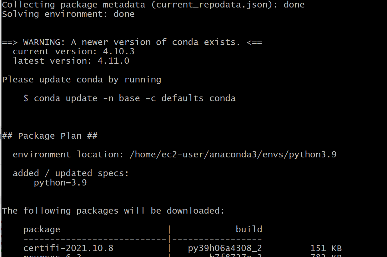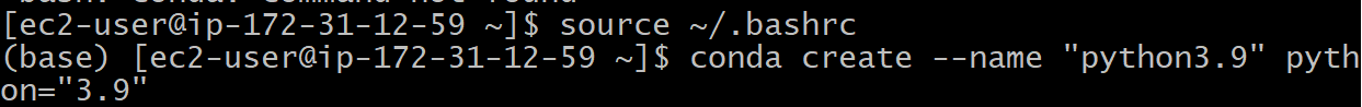 * 위 명령어를 해석하자면, conda create를 하여 conda 가상환경을 만들어주고, 가상환경 name은 "python3.9"란 이름으로 python버젼 3.9로 설치하는 것이다.