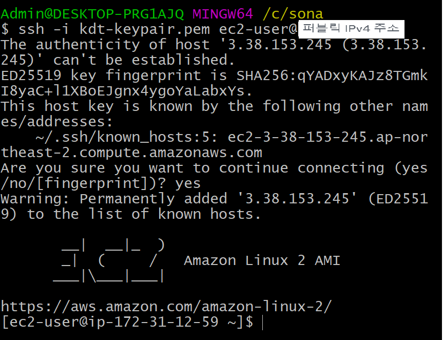ssh - i [.pem 파일] ec2-user@퍼블릭ip주소