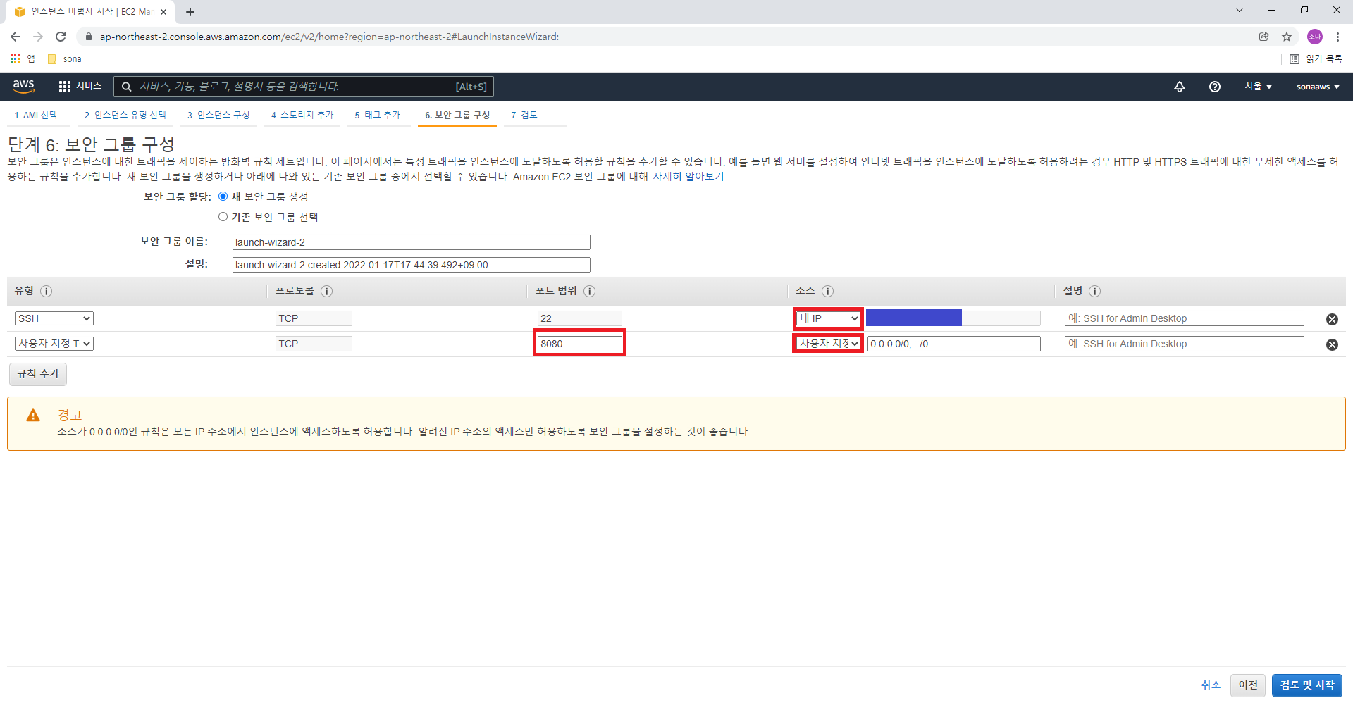 9. [단계6] 보안 그룹 구성 >>> [다음]버튼 누르기