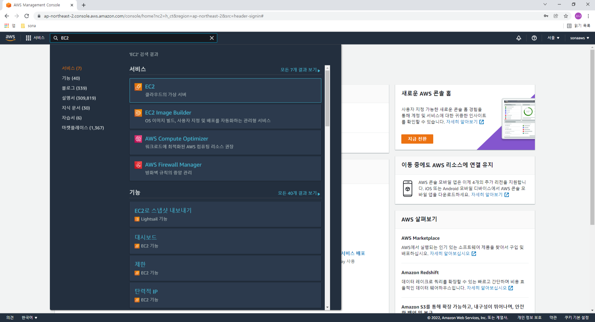 3. 왼쪽 상단 검색창에 EC2 메뉴 를 검색한다.