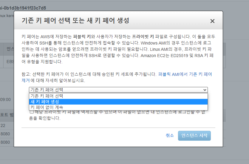 11. 시작하기 버튼을 누르면 팝업창으로 [기존 키 페어 선택 또는 새 키 페어 생성]이 뜬다.
