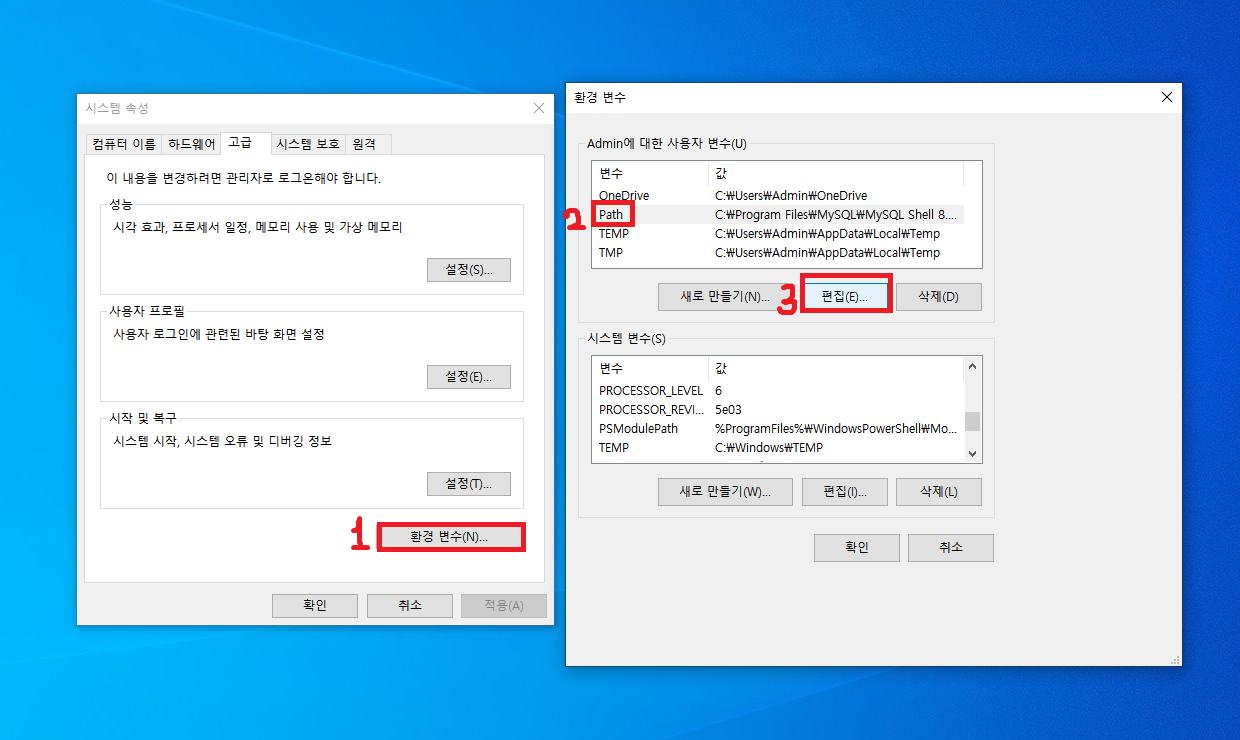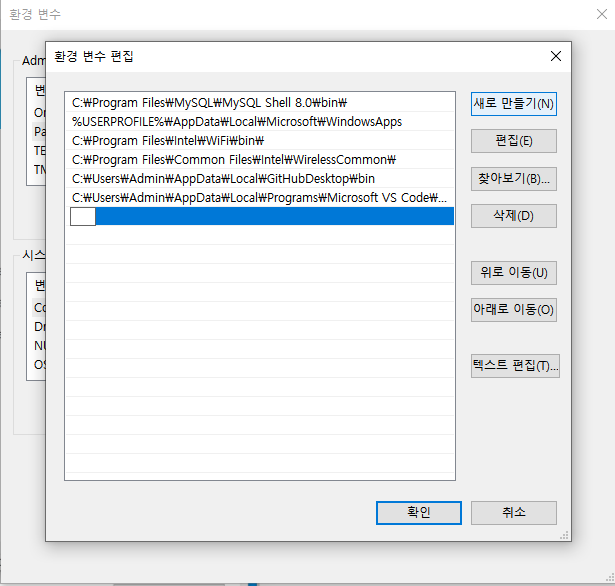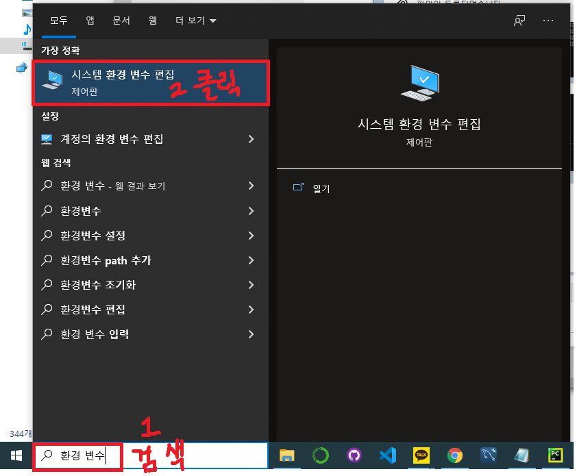 ---> 환경변수 메뉴는 아래 작업표시줄에 '환경 변수'를 검색하면,