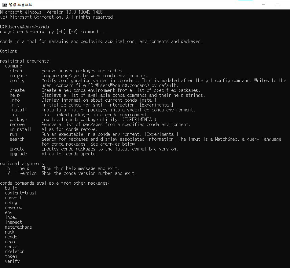 * 다시 새로 [cmd 명령어 창]을 열고 conda 명령어를 입력한다.