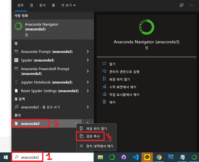 * 파일 경로 찾는 방법은 작업표시줄에서 [anaconda3] 검색 후 ---> 폴더 anaconda3의 오른쪽 클릭을 해서 [경로 복사]한다.
