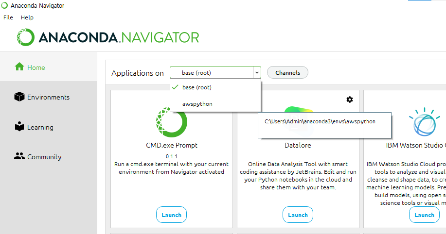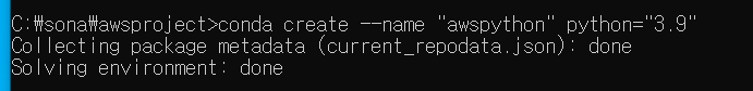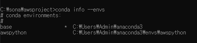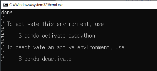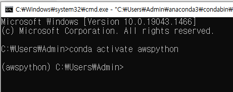 *나의 경우는 awspython이라는 가상환경이름을 활성화 시켰고 -> 명령어창에서 (awspython)으로 바뀌었다.