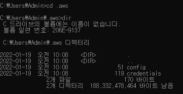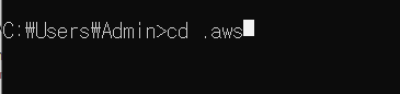 ; cd .aws 입력하여 이동 후 >>> dir 입력해서 config 로컬파일 있는지 확인하기