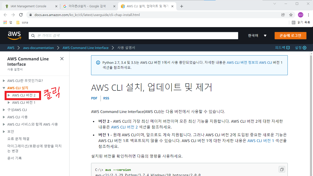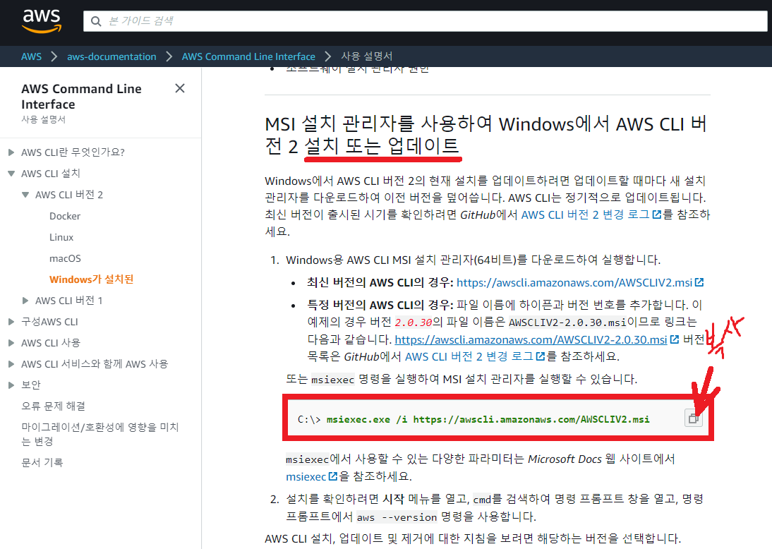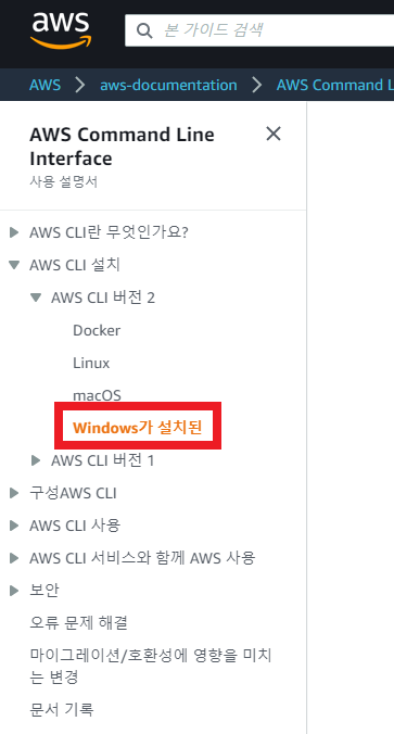 왼쪽 메뉴에서 AWS CLI 버젼2를 클릭한다! (버젼2에서 좀더 기능이 추가되어있다고 하니 최신 버젼으로 클릭클릭🖱)