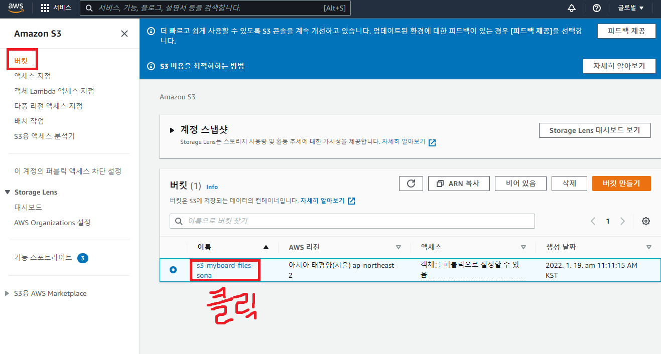 ; 다시 [S3 ]메뉴에서 [버킷]메뉴에 들어가, 권한 설정해줄 S3버킷을 누른다.