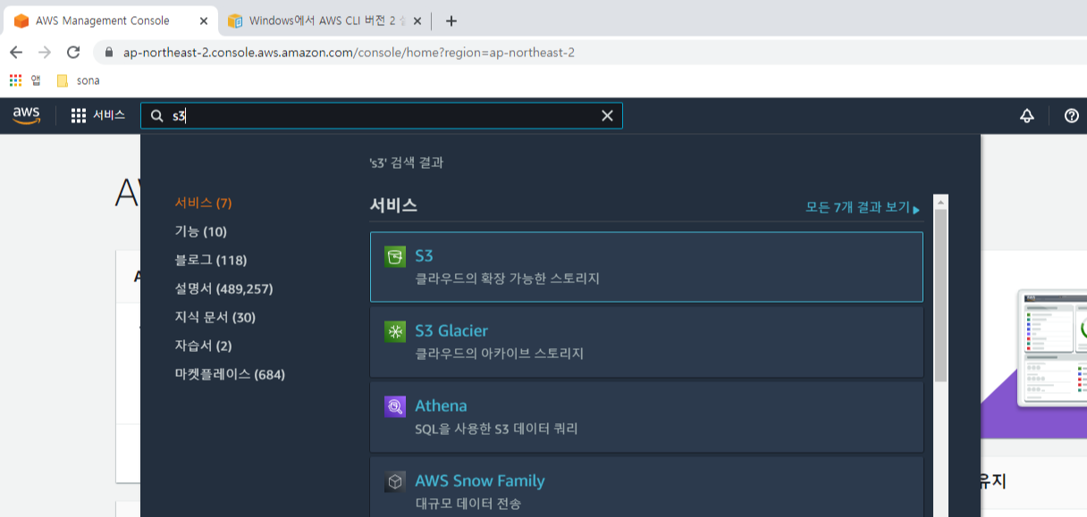 ; aws.amazon.com에 접속해서 로그인을 한뒤 상단검색창에 S3를 검색한다!