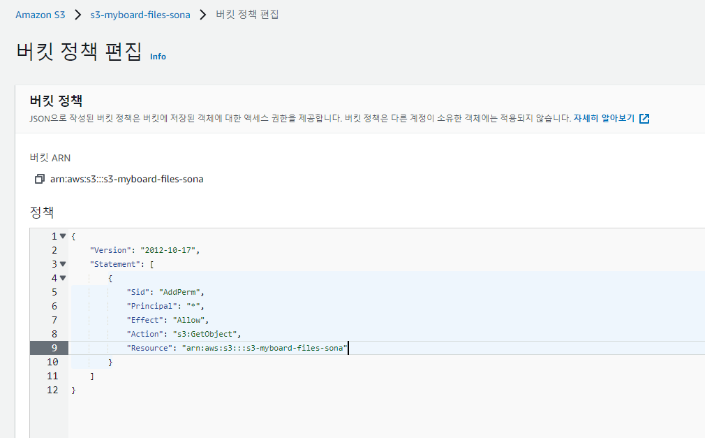 - 정책 칸 바로 위에 써져있는 버킷 ARN 복사버튼을 눌러 복붙하면 편리함