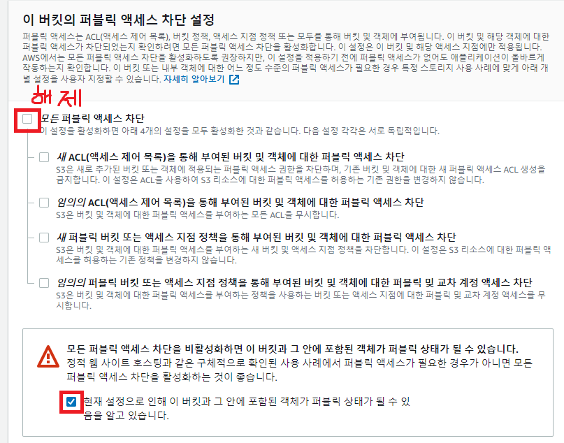 나의 퍼블릭ip에서도 접속하는 걸 원하기에 [모든 퍼블릭 액세스 차단]을 해제해주고, 아래 '⚠ 퍼블릭 상태가 될 수 있음을 알고 있습니다'을 선택해주었다.