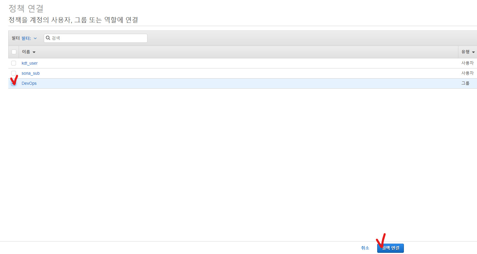 5-2. 정책을 연결해줄 사용자 or 그룹을 선택 >>> [정책연결]을 클릭