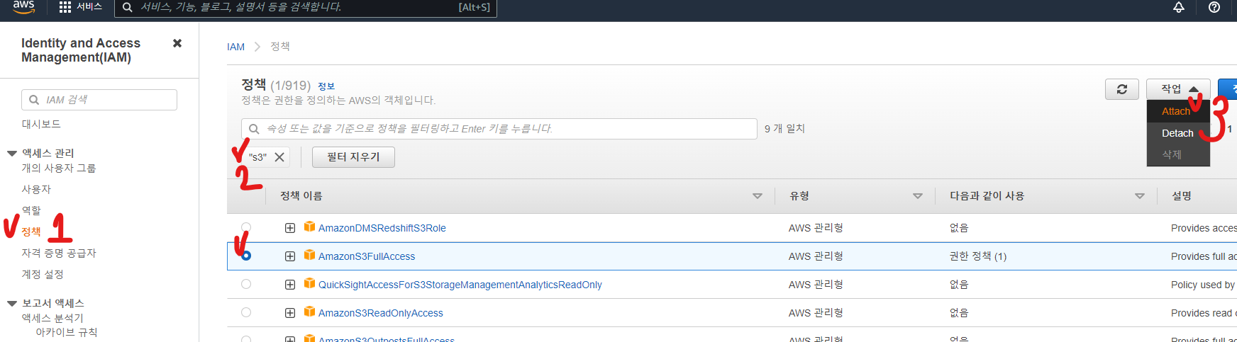 5-2. 왼쪽 메뉴에서 [정책]을 선택 >>> s3 검색해서 AmazonS3FullAccess를 선택 >> 작업 중 attach를 선택하기