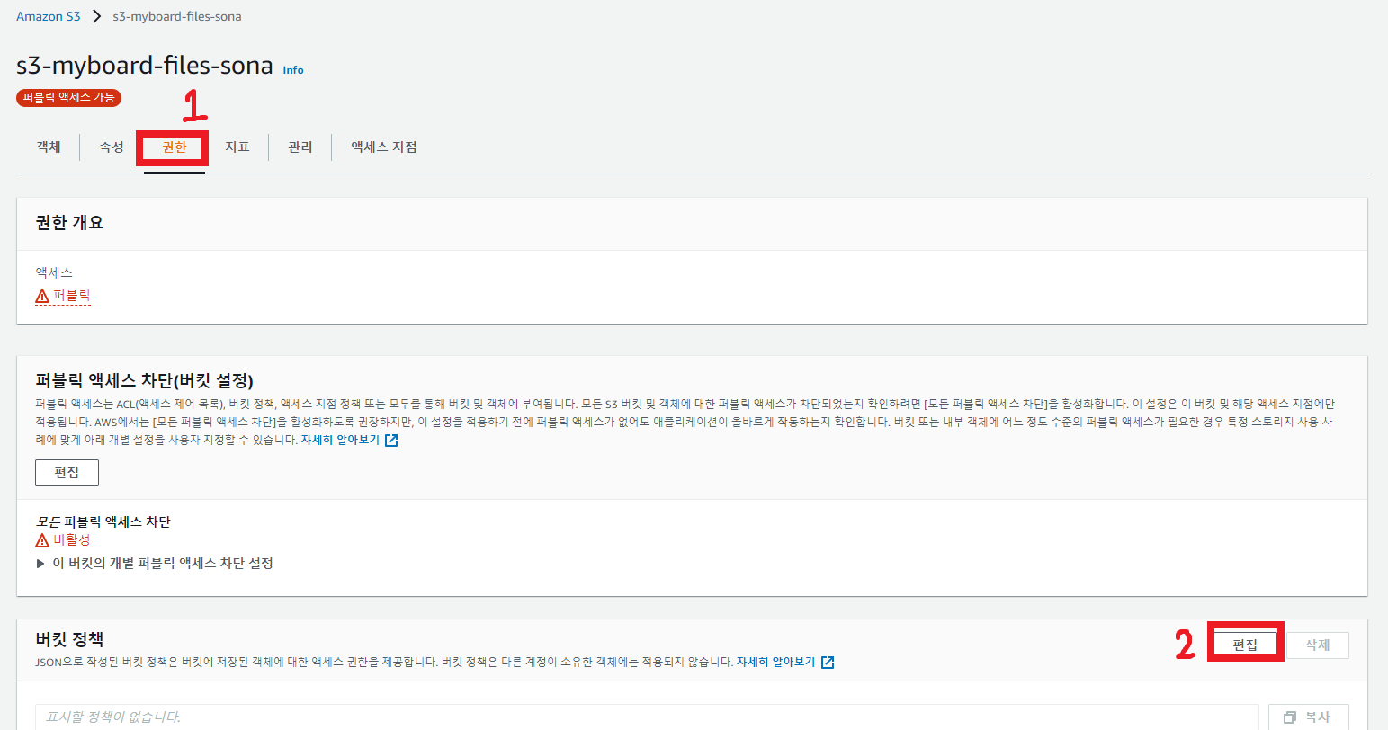 ; 선택한 S3버킷에서 [권한] 카테고리에 들어가 버킷 정책을 [편집] 한다.