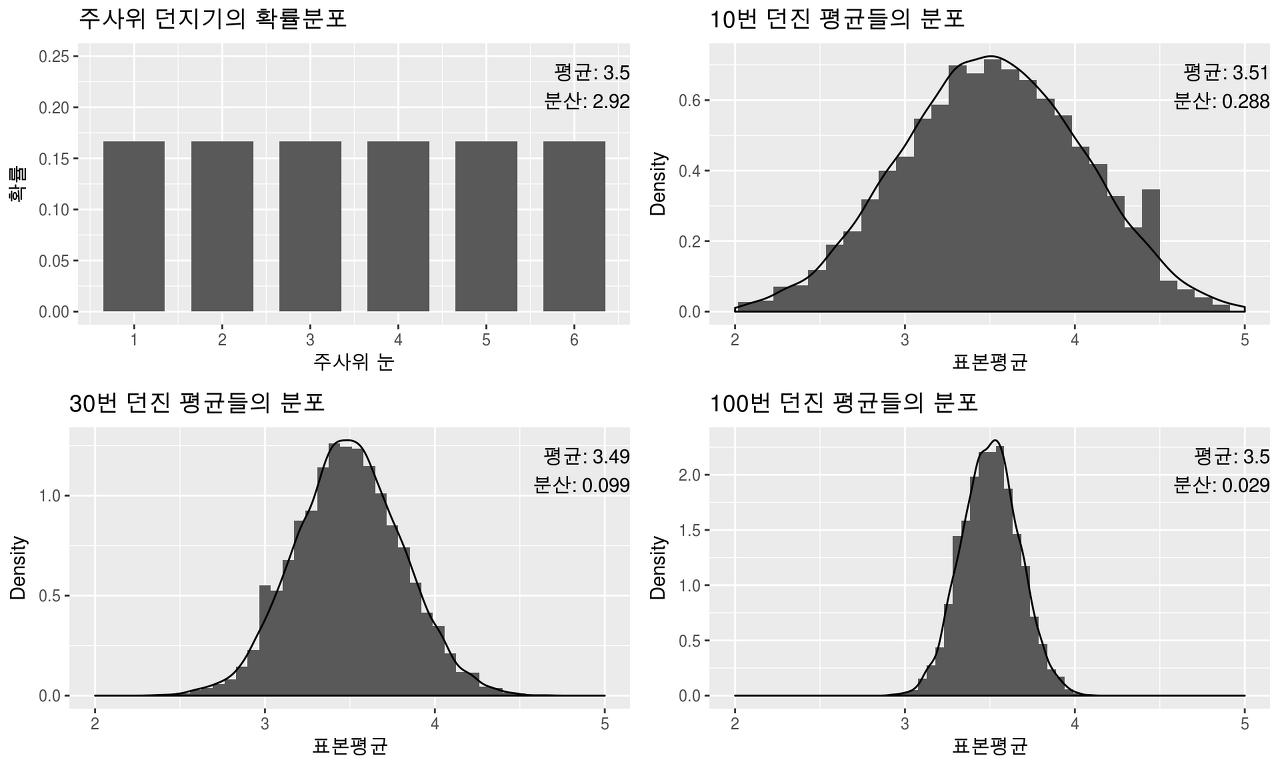 '중심극한정리'라는 개념인데 충분히 많은 수의 상호독립적인 확률 변수들의 합 또는 평균의 표본분포가