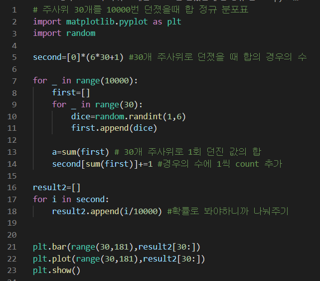 아래의 사진은 주사위의 숫자가 나올 확률의 분표를 그린 경우여서 위에서 작성한 주사위 합과는 살짝 다르지만,