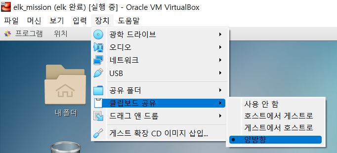 1. [장치] -> [클립보드 공유] -> [양방향] 선택