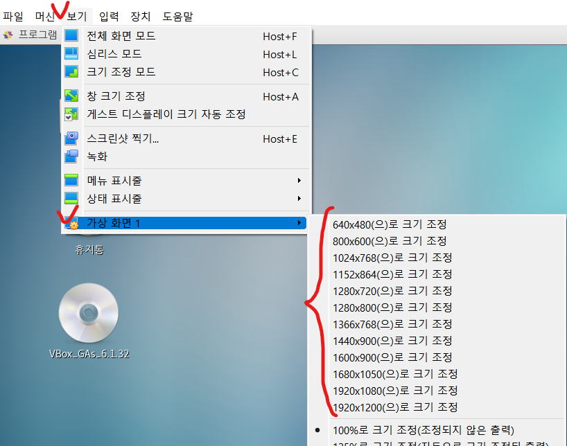 : 게스트 확장CD를 설치가 안되어 있으면, 크기조정하는 칸이 회색 글씨로 되어있다.