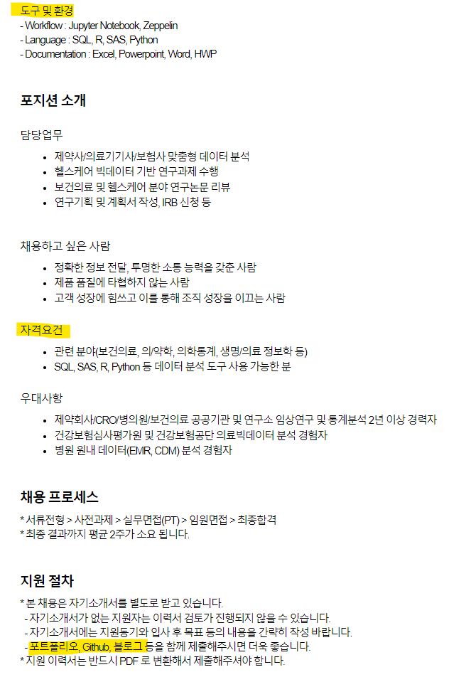 의료분야 데이터 분석 업무 채용공고를 검색해보았다.