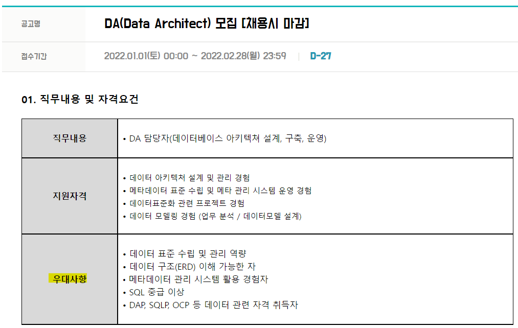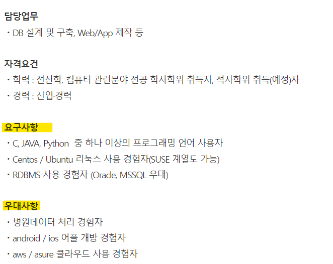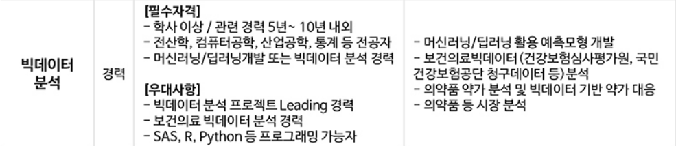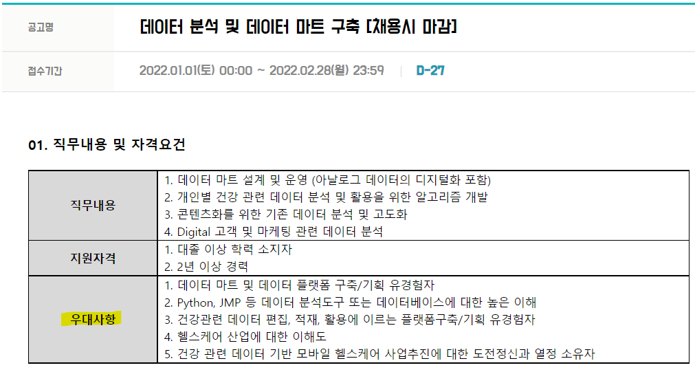 01. 직무내용 및 자격요건 직무내용1. 데이터 마트 설계 및 운영 (아날로그 데이터의 디지털화 포함)2. 개인별 건강 관련 데이터 분석 및 활용을 위한 알고리즘 개발3. 콘텐츠화를 위한 기존 데이