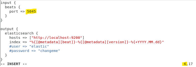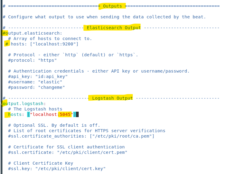 (3) elasticsearch output은 주석처리하고, logstash output 주석풀기 및 포트번호 바꾸기