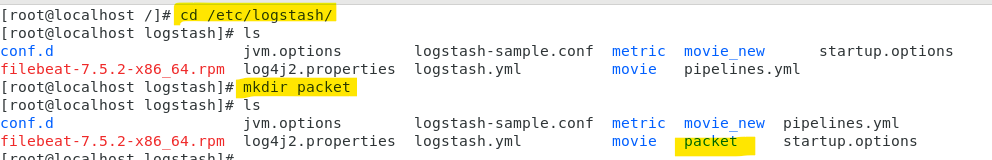 1) /etc/logstash 경로에서 들어가서 mkdir로 packet이란 폴더를 만들어준다.