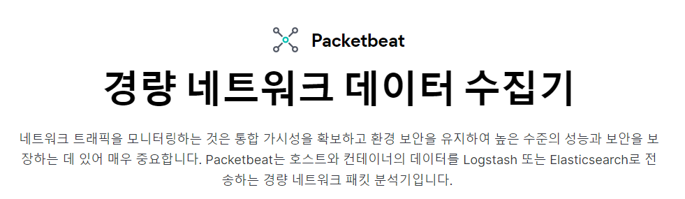 * 기능 : 서비스와 애플리케이션 모니터링/ 프로토콜을 선택하거나 원하는 프로토콜을 직접 구축가능 / 네트워크 트래픽 검색 및 분석/ Elasticsearch나 Logstash로 데이터를 수집하고 Kibana에서 시각화/ 모든 데이터 요소 모니터링