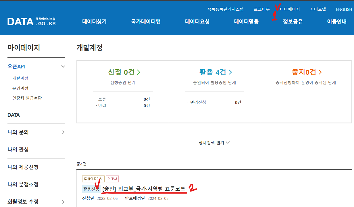 2) 상단의 [마이페이지]에서 활용 승인된 데이터를 확인 후 누른다.