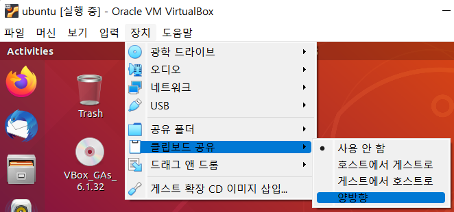 1. [장치] -> [클립보드 공유] -> [양방향] 선택