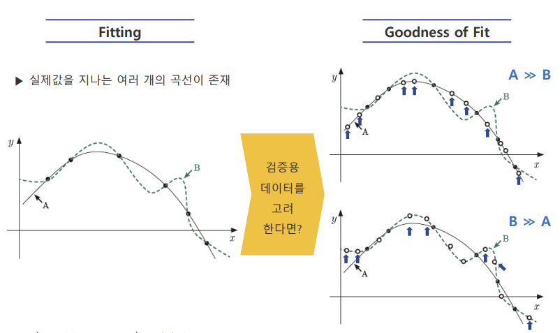 * Fitting: 실제값을 지나는 여러 개의 곡선이 존재
