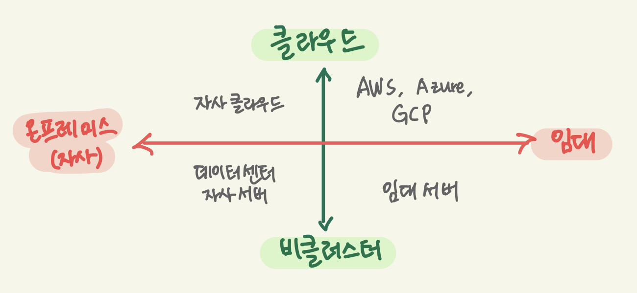 온프레미스와 클라우드는 온전히 반대되는 말은 아니지만, 자사에서 물리적인 모든 것을 충당하는 체제에서 클라우드 환경을 임대하여 사용하는 체제로 크게 움직이고 있다고 이해하면 된다.
