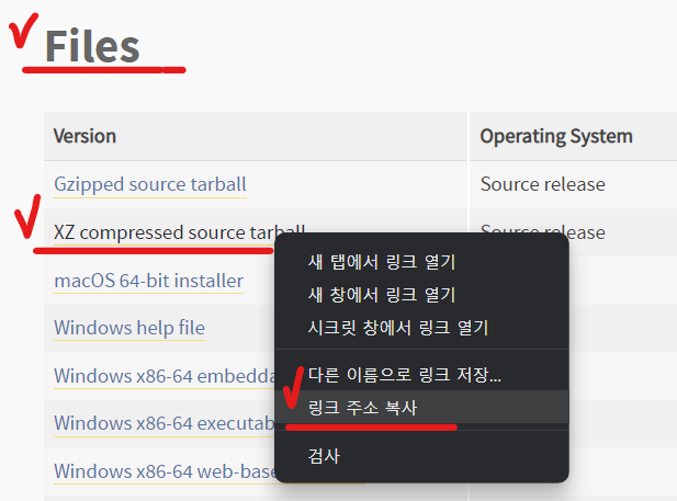 * 파이썬 3.8.5의 경우라면 https://www.python.org/downloads/release/python-385/에 접속해서 아래쪽에 files에서 원하는 파일 다운로드 링크주소를 복사한다.