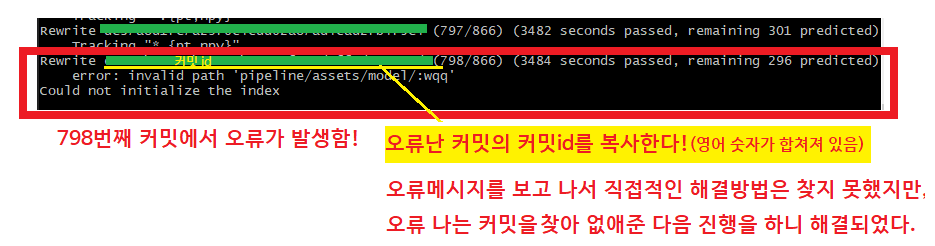 해결방법은 해당 커밋을 삭제하니 잘 진행되었다.