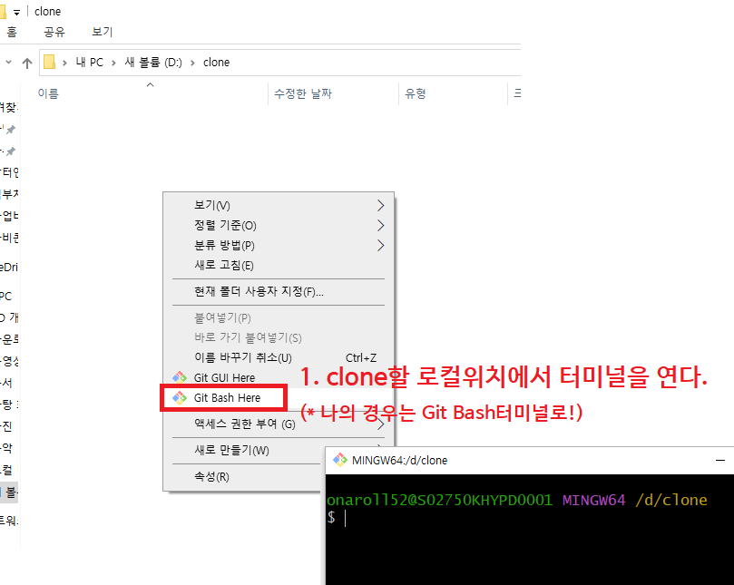 1. 클론할 로컬위치에서 터미널을 열기