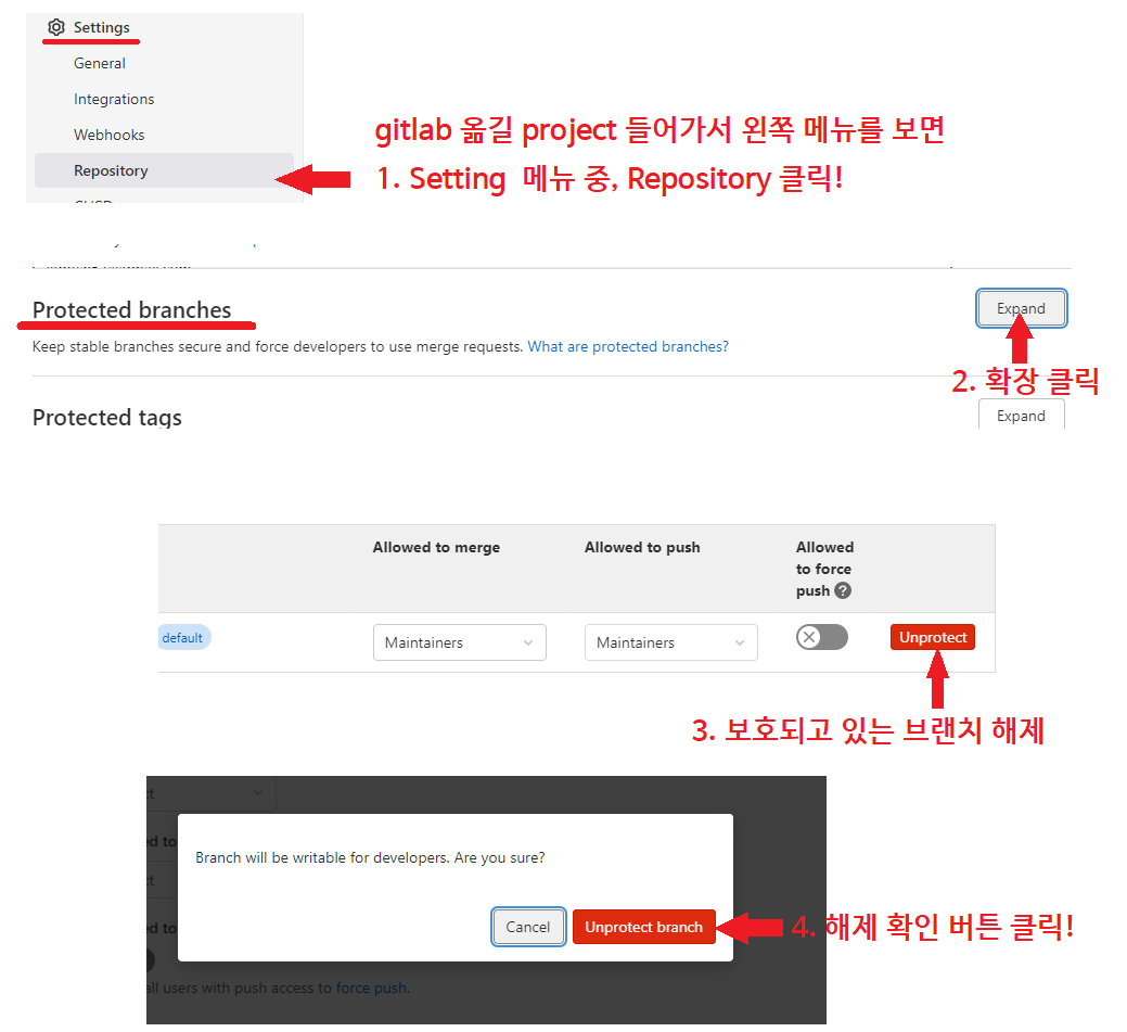 3) Gitlab Branch protect 해제하기