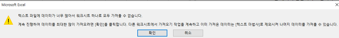 -> 엑셀: 데이터>텍스트/csv 파일 가져오기 메뉴로 로드한다고 해도... 아래와 같은 문구가 뜬다.