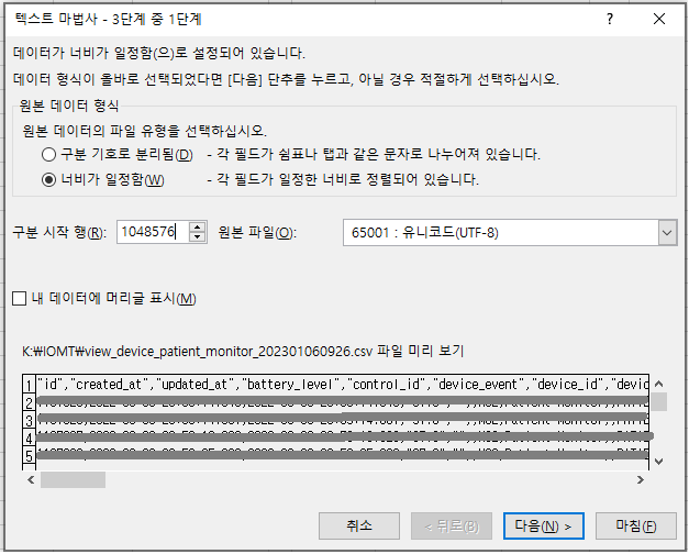 ← ← 텍스트 마법사를 활용해 그다음 나머지 데이터 가져오기 시도하는 화면