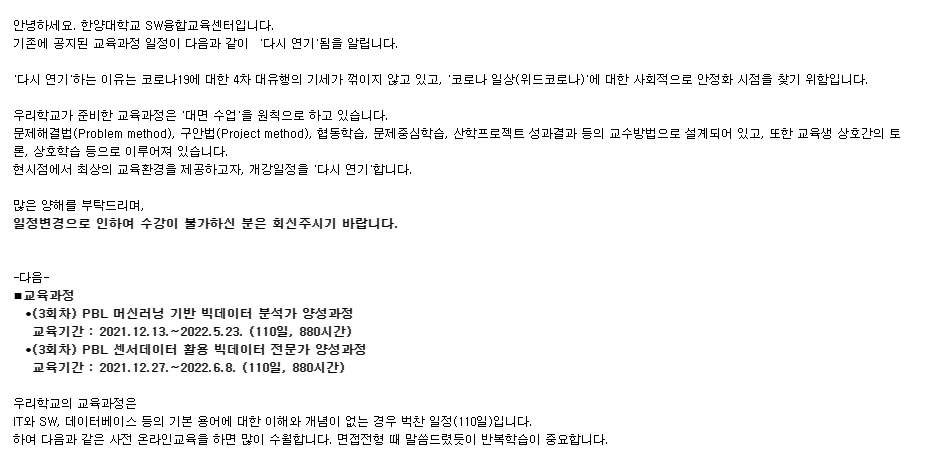 11월부터 시작예정이었던 교육이................코로나로 인해 일정 연기..........