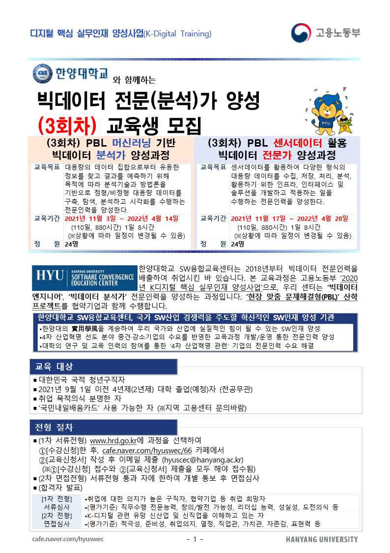 K디지털 트레이닝 한양대학교 (3회차) PBL 머신러닝 기반 빅데이터 분석가 양성과정