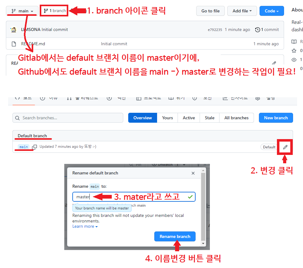 2) default branch 이름 동일하게 맞추기 (아래 캡쳐본 참고하기!)